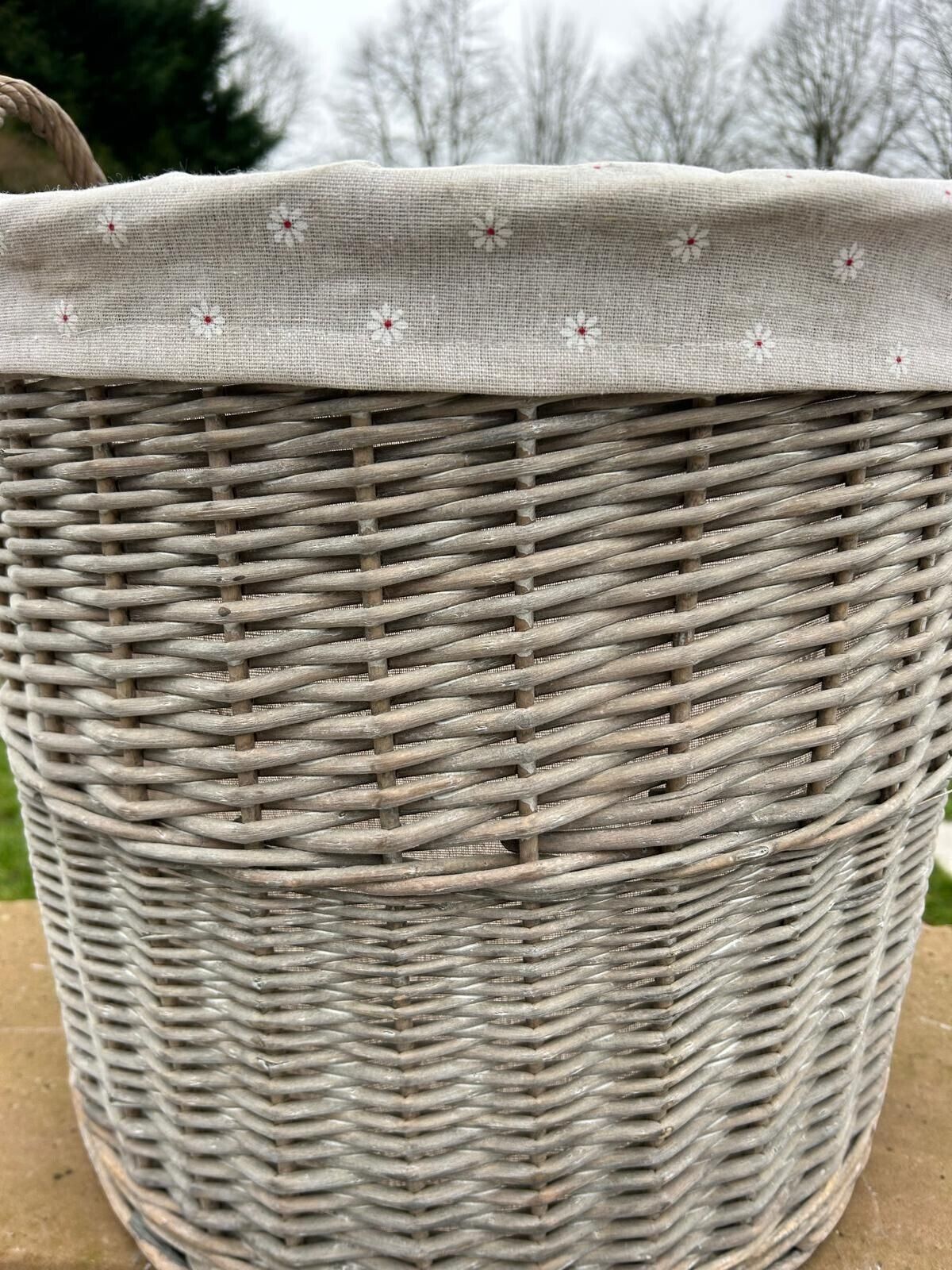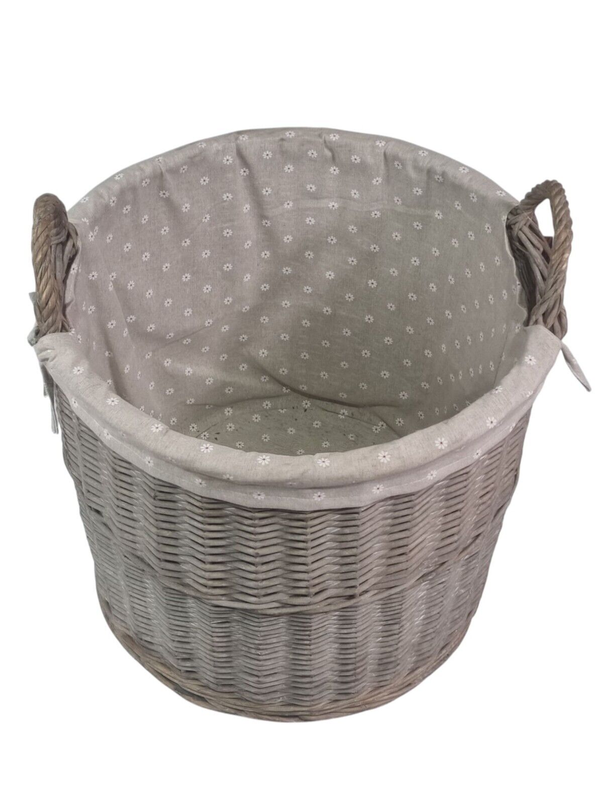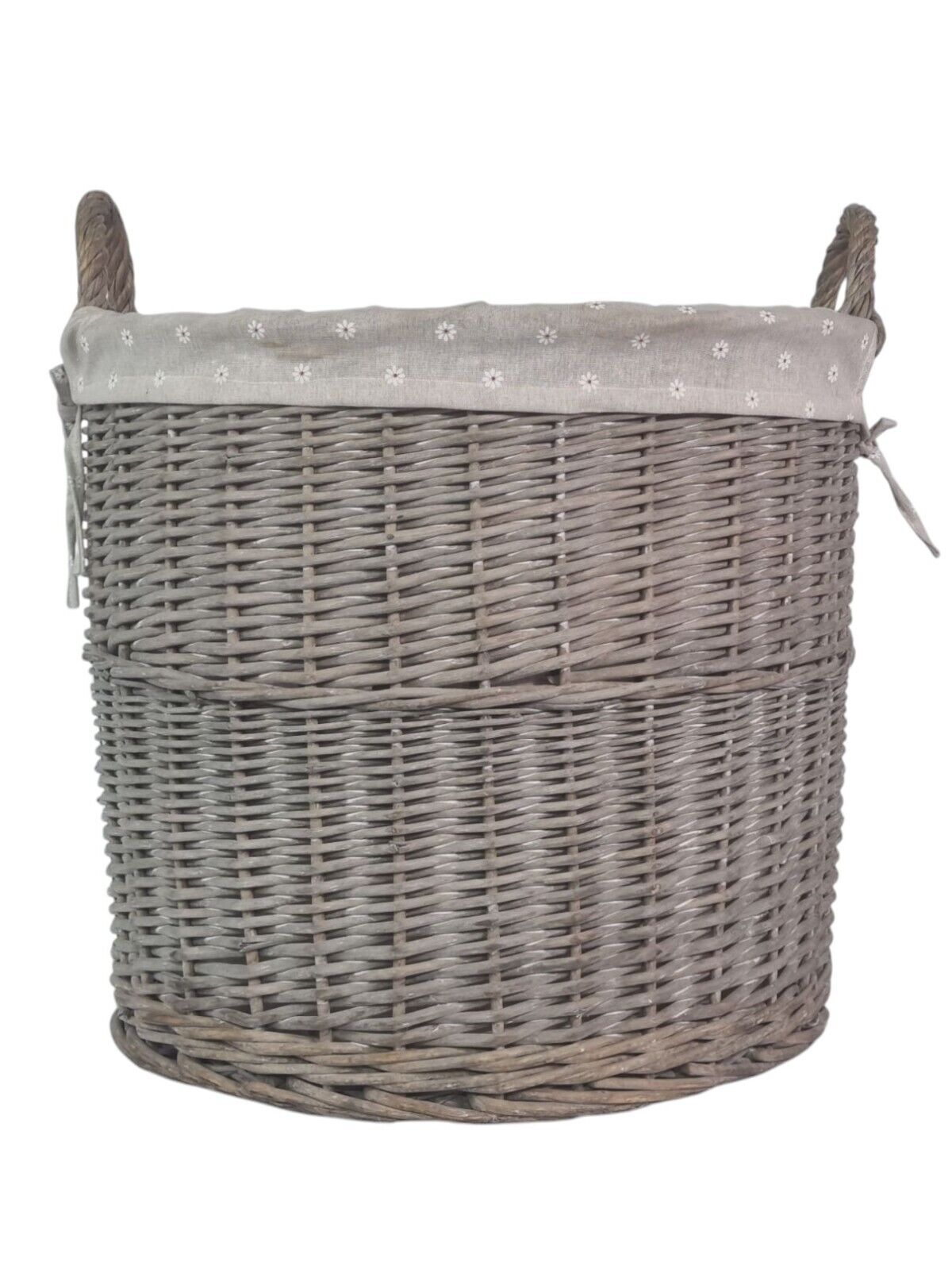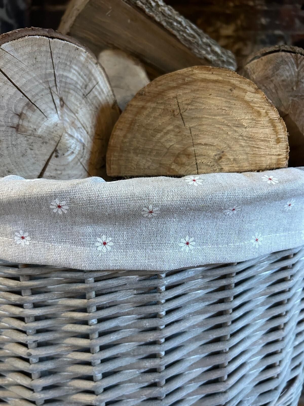Round Grey-wash Wicker Log Fireside Storage Basket with Daisy Liner