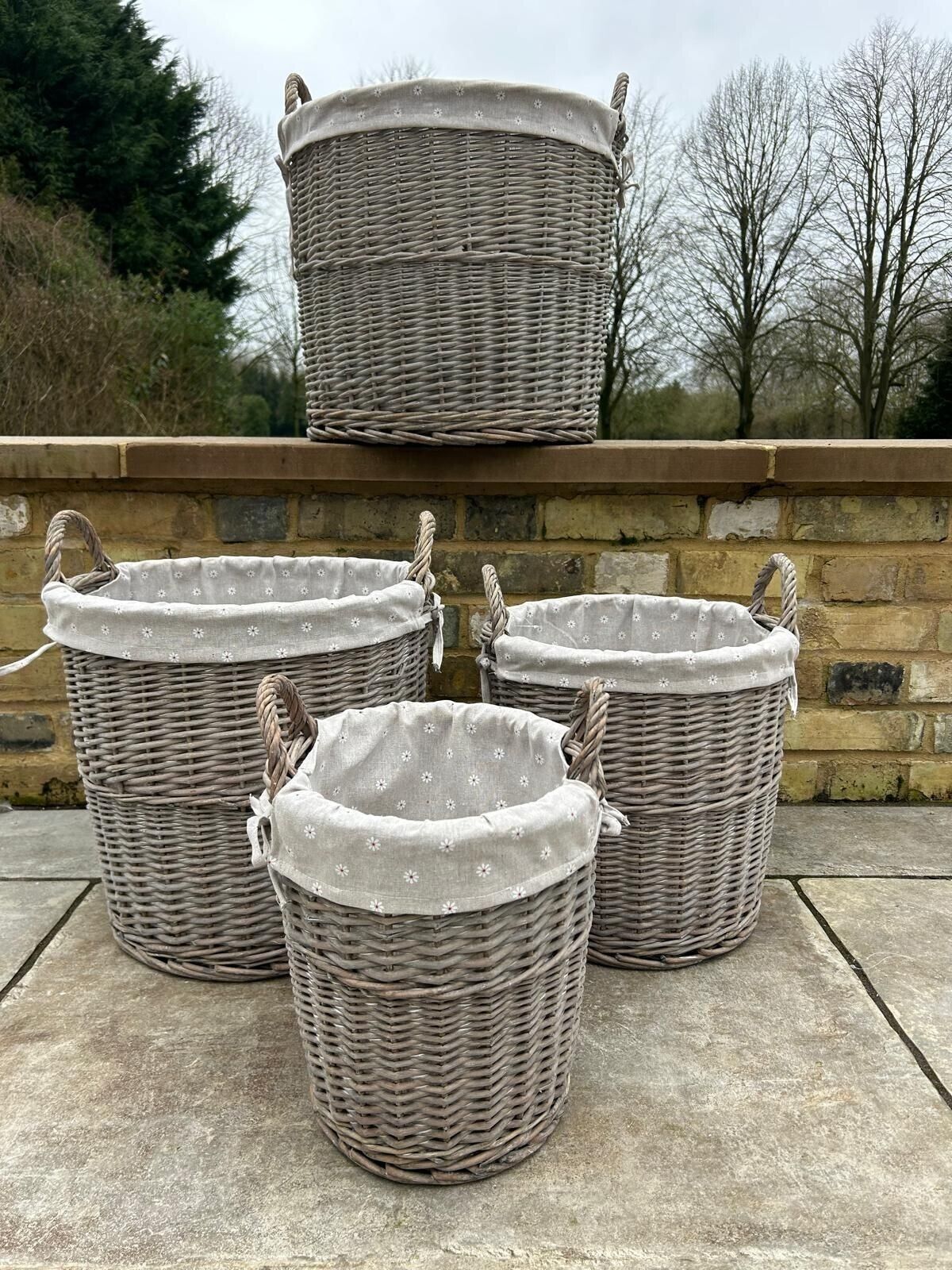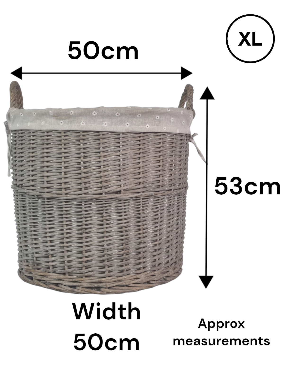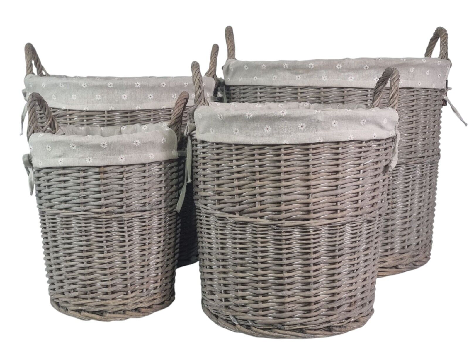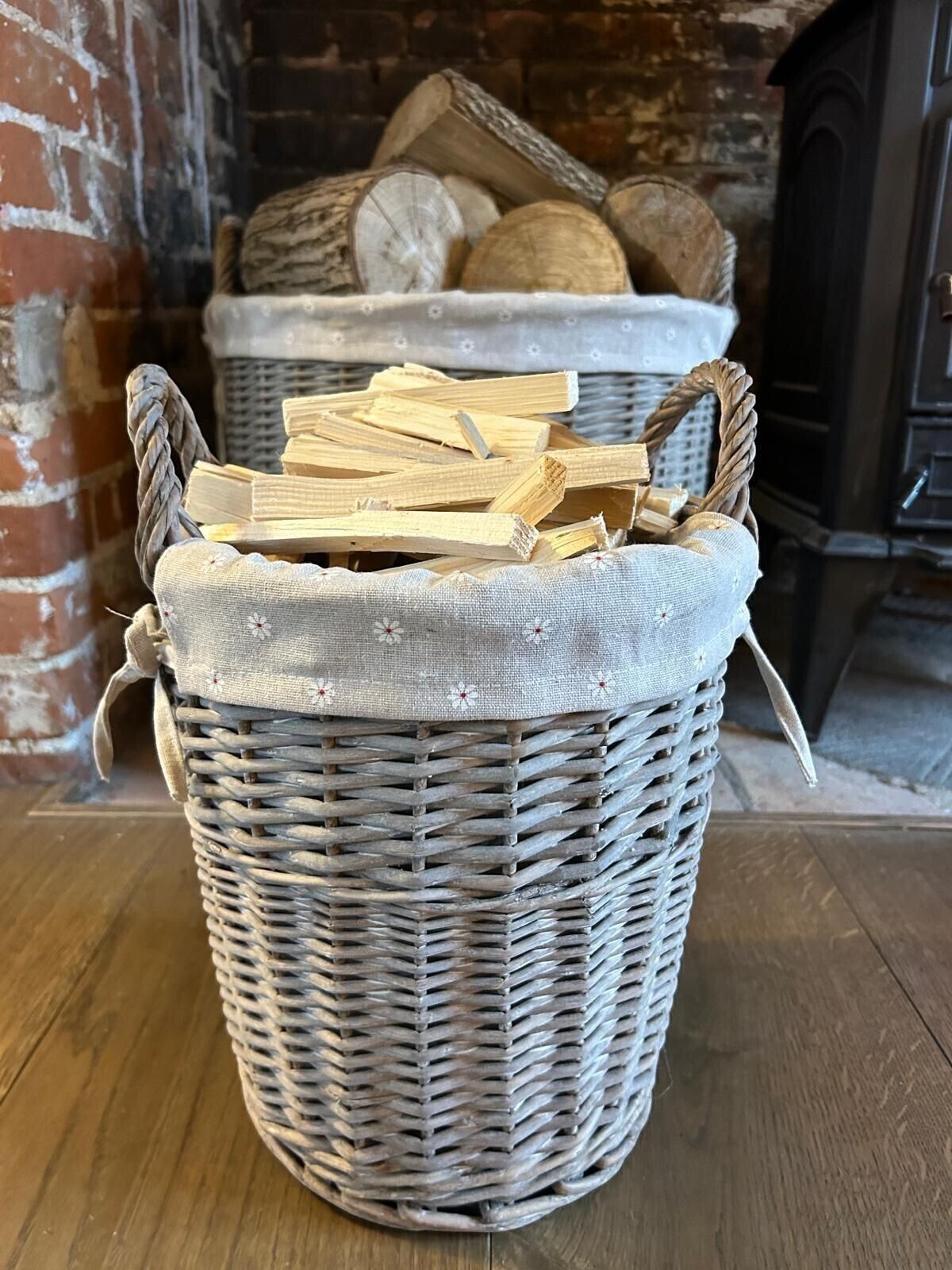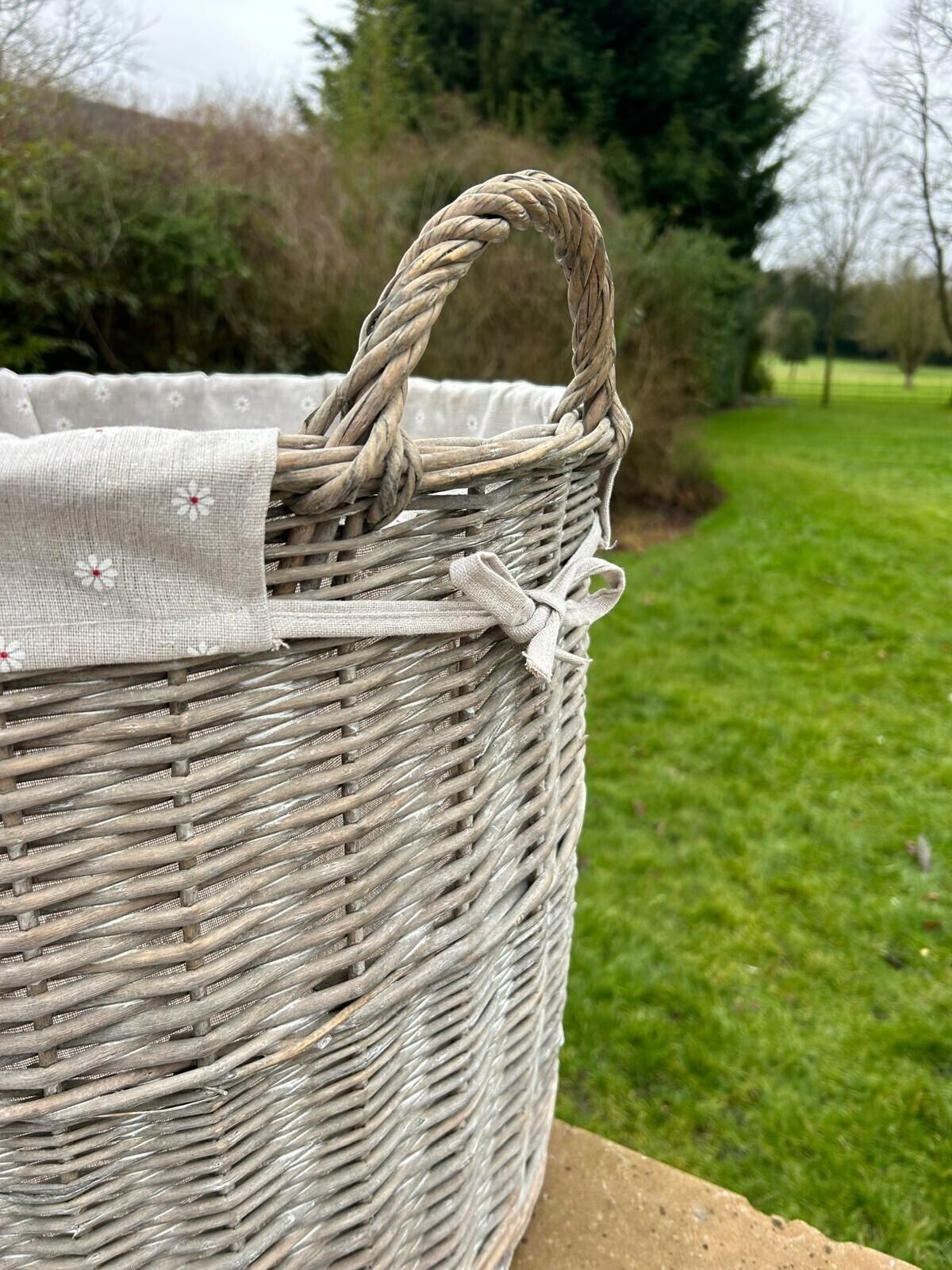 Round Grey-wash Wicker Log Fireside Storage Basket with Daisy Liner