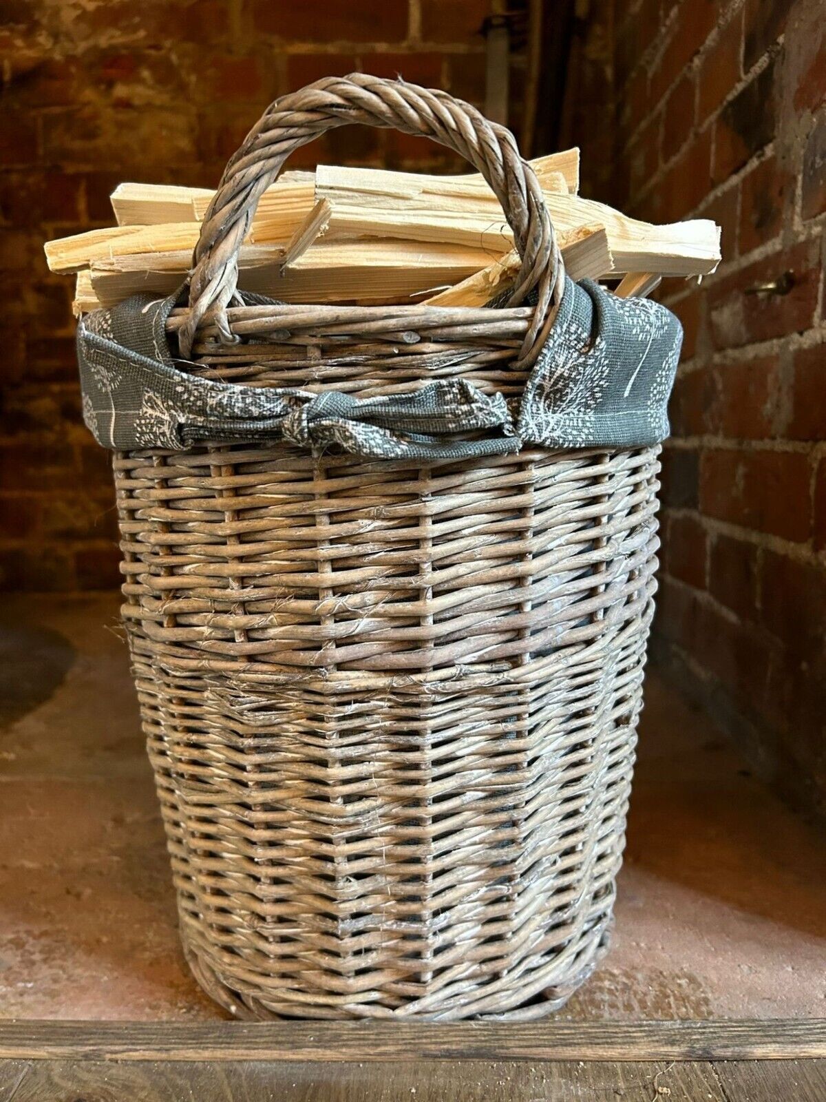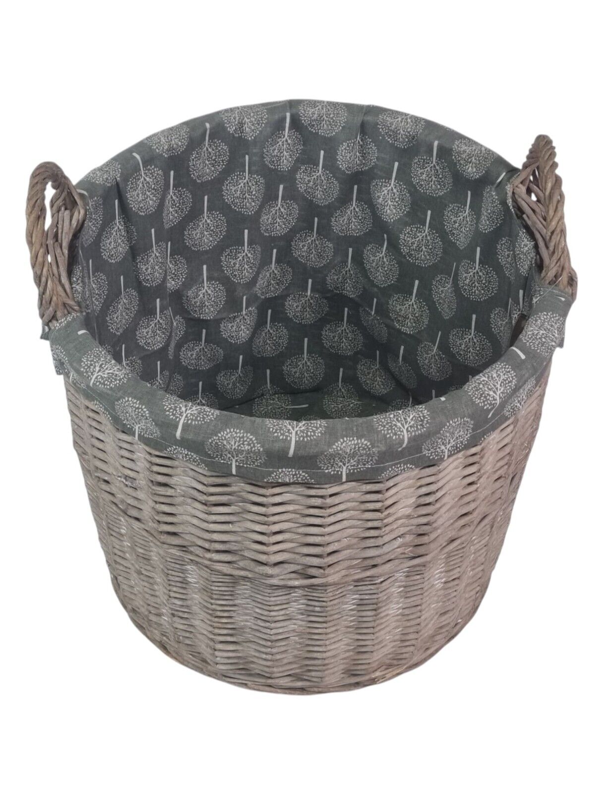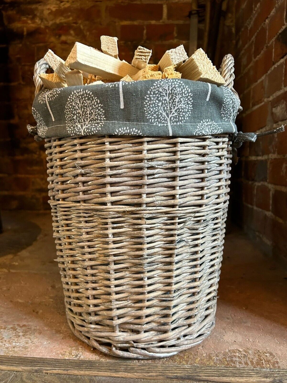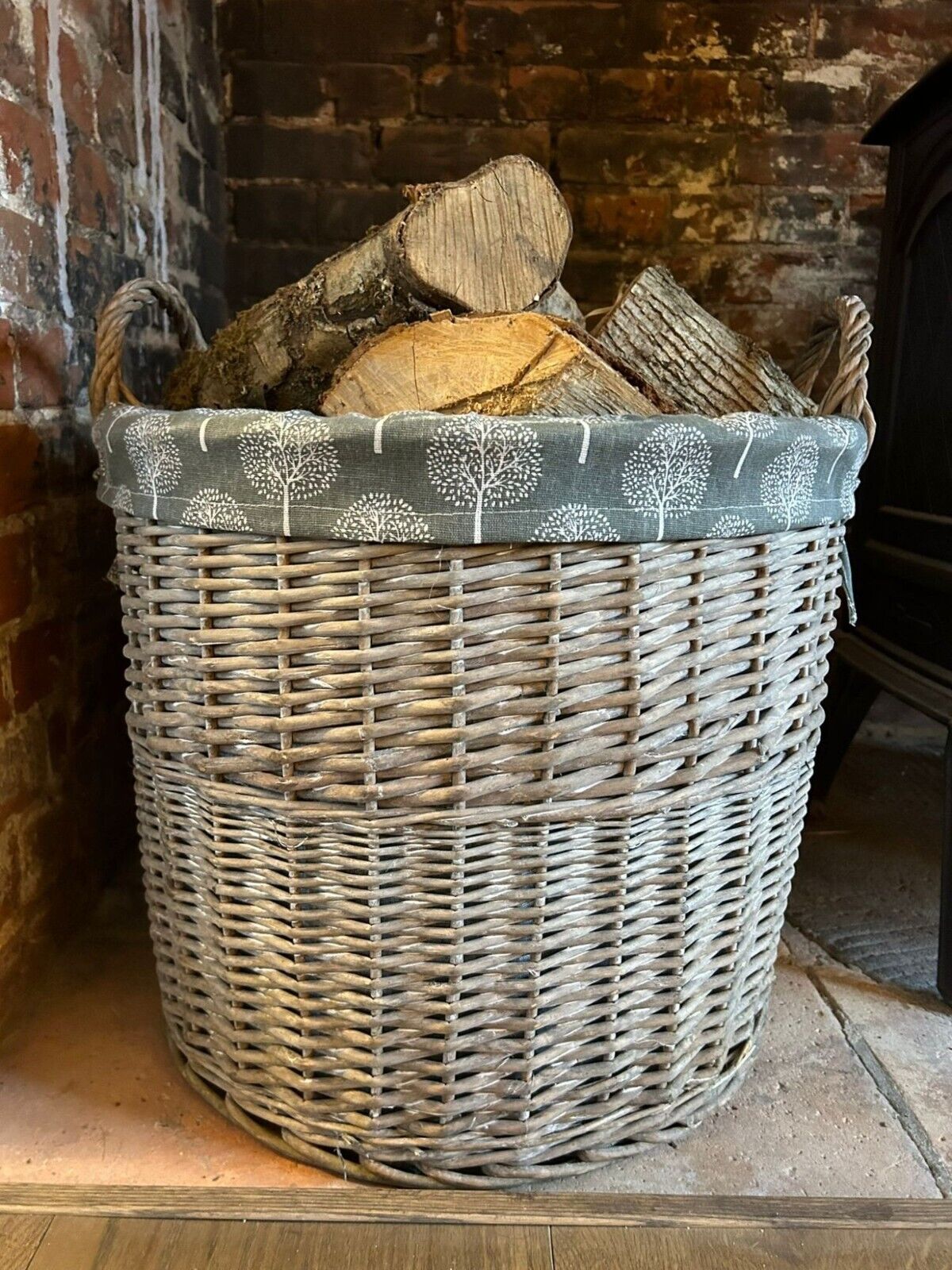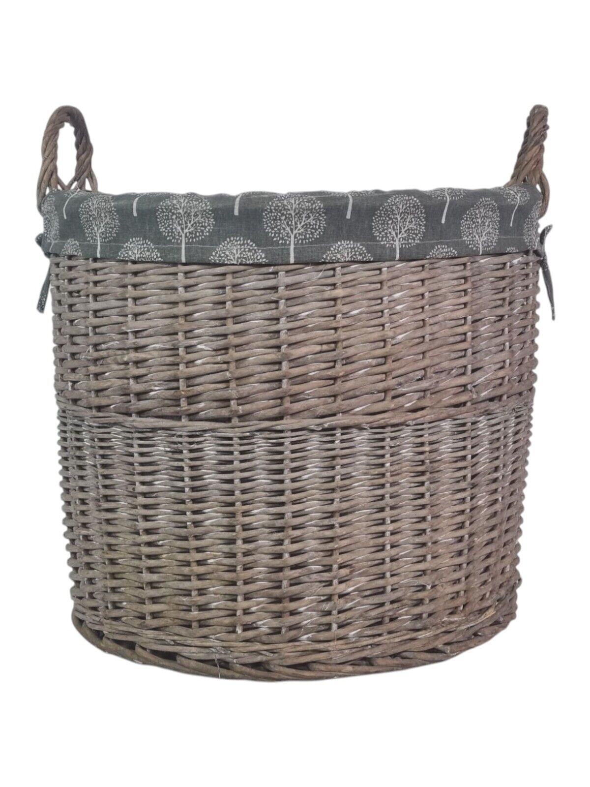Round Grey-wash Wicker Log Fireside Storage Basket with Mulberry Liner