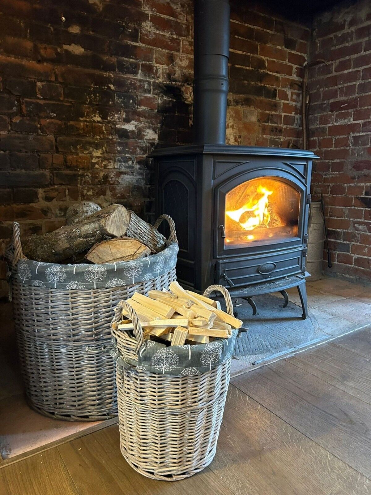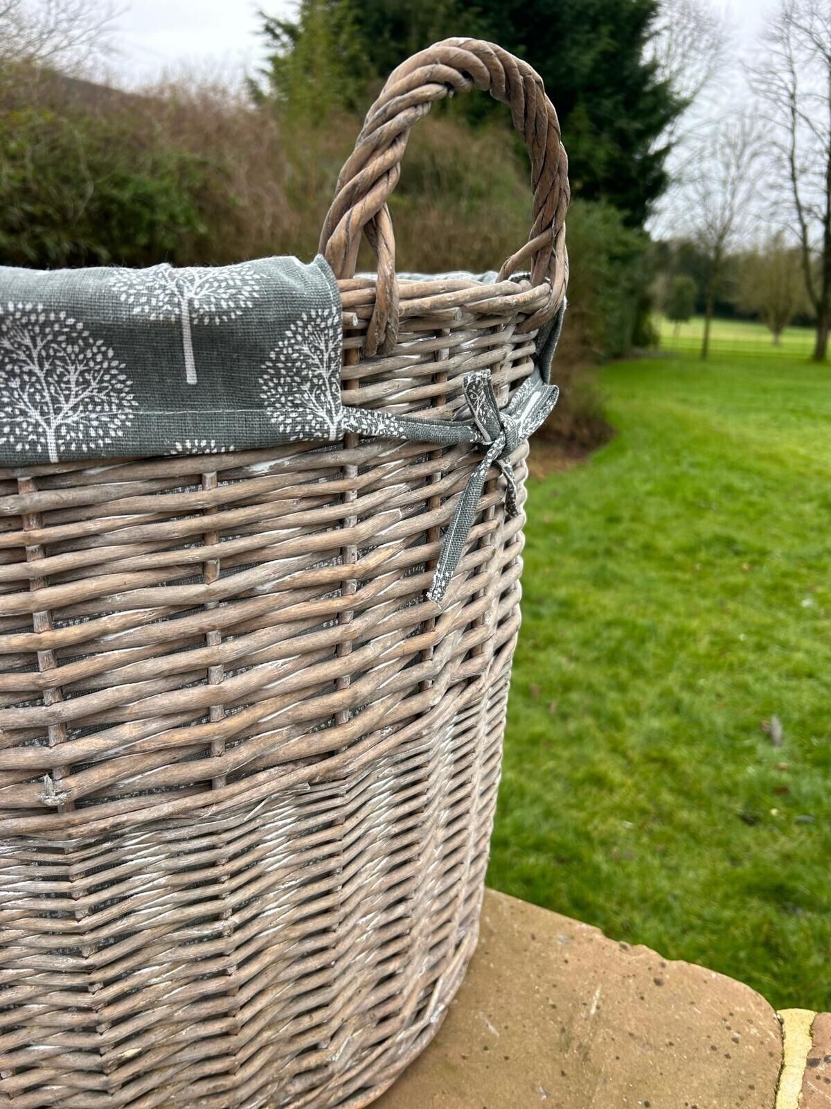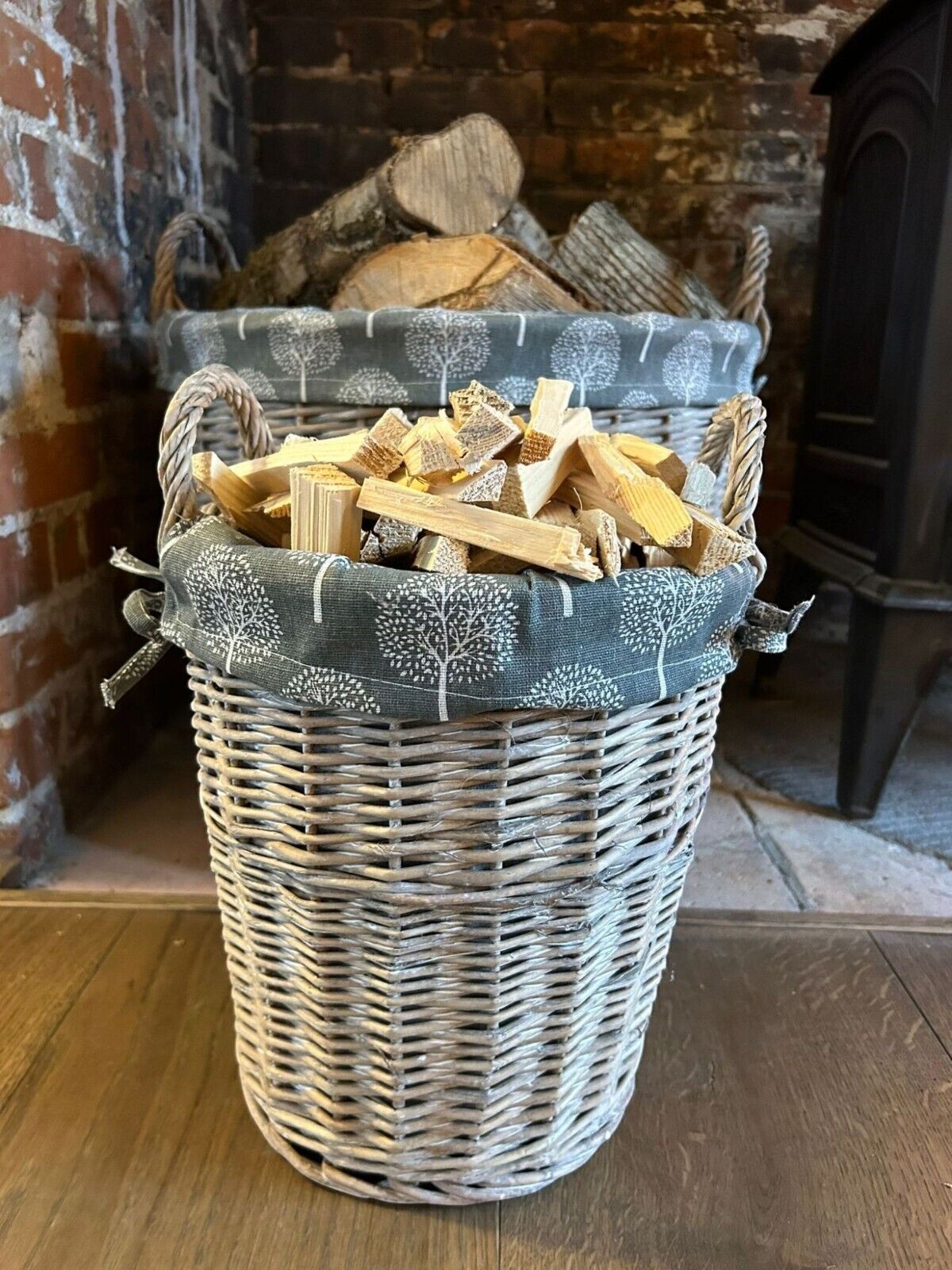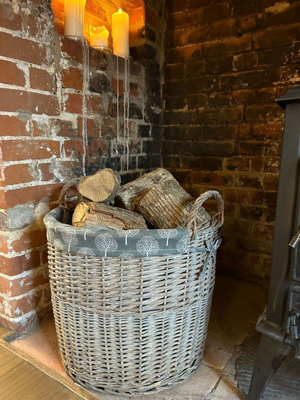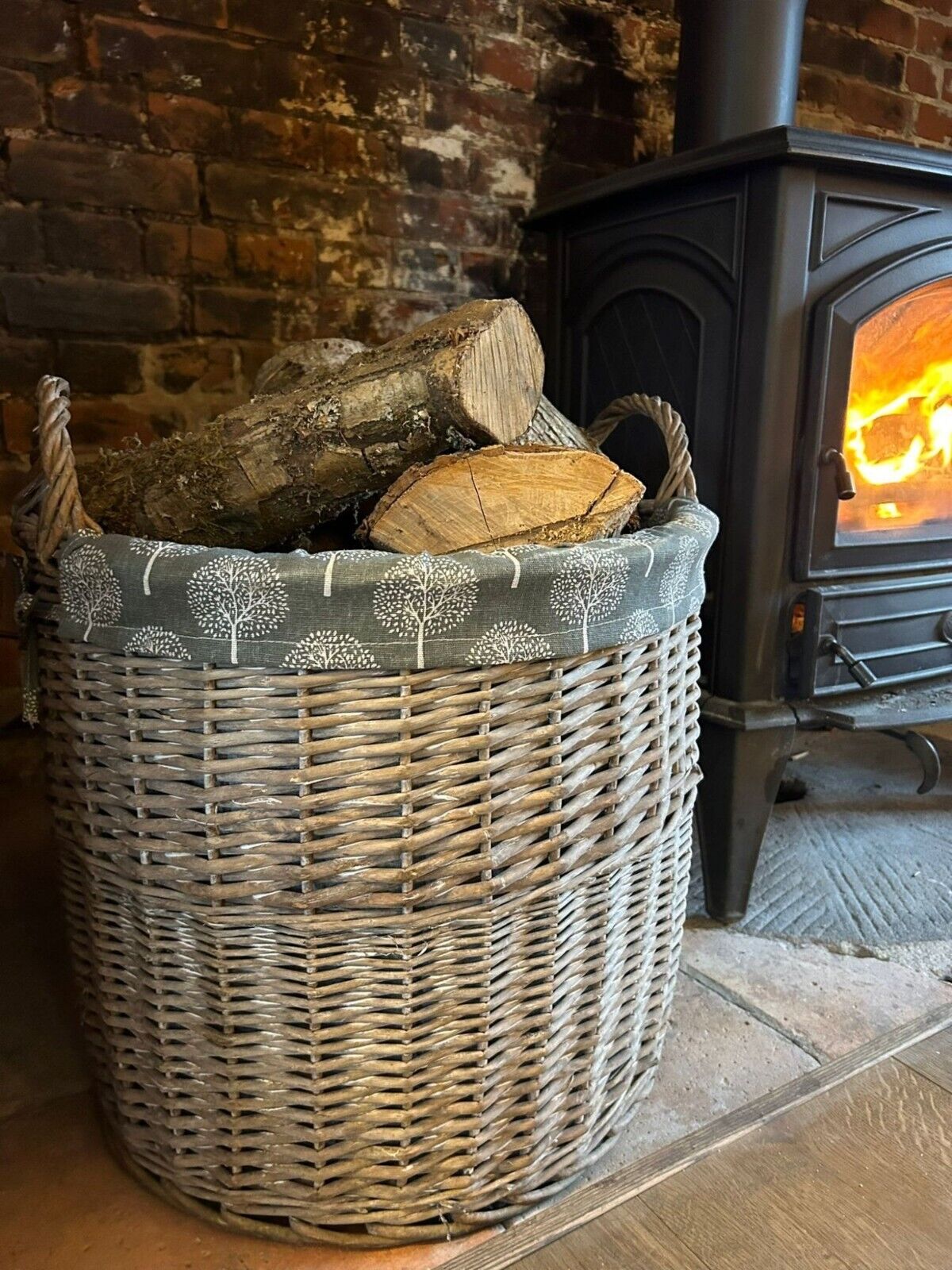 Round Grey-wash Wicker Log Fireside Storage Basket with Mulberry Liner