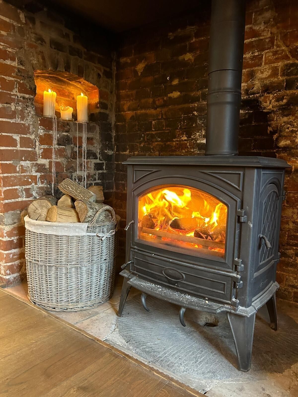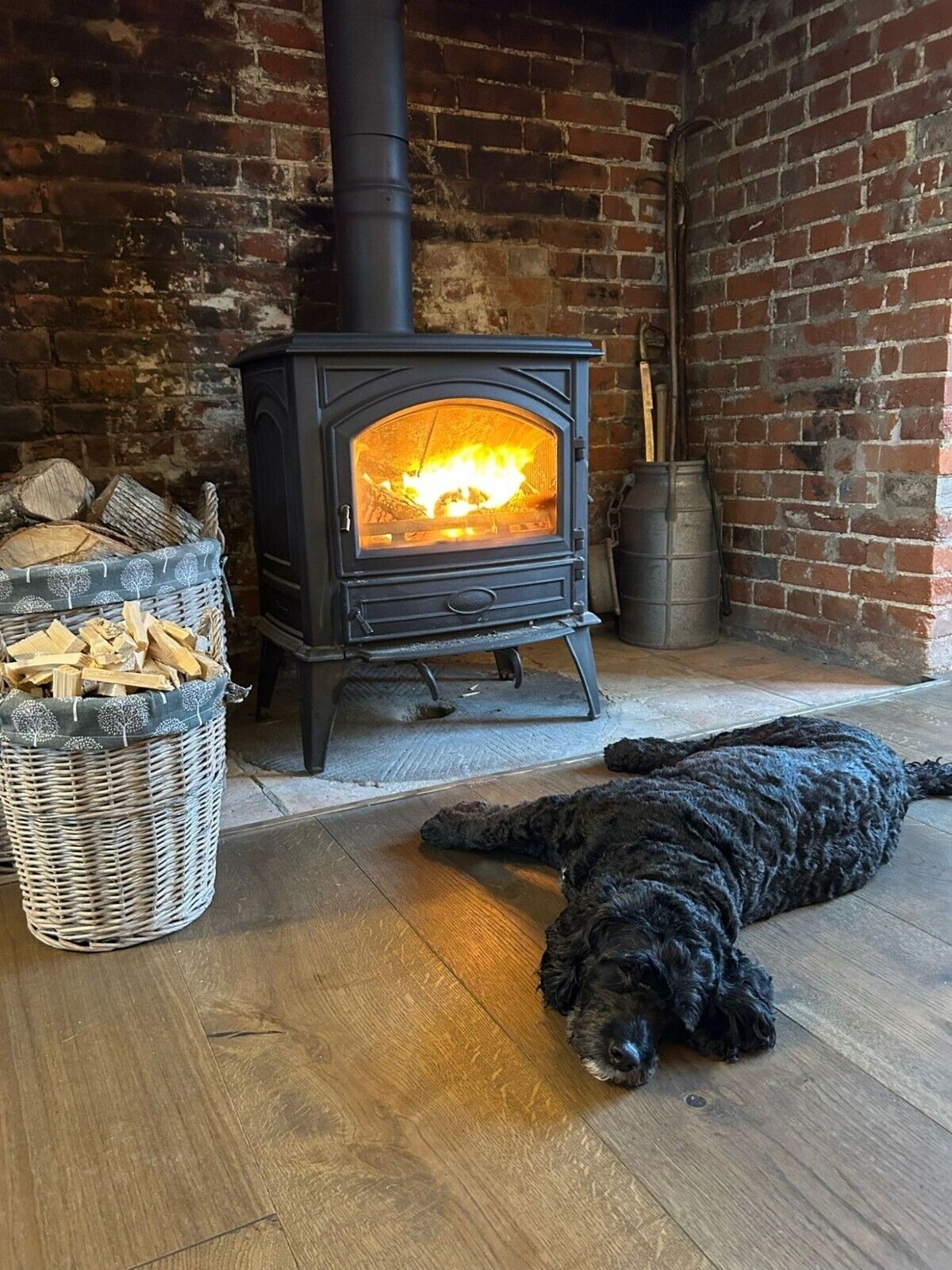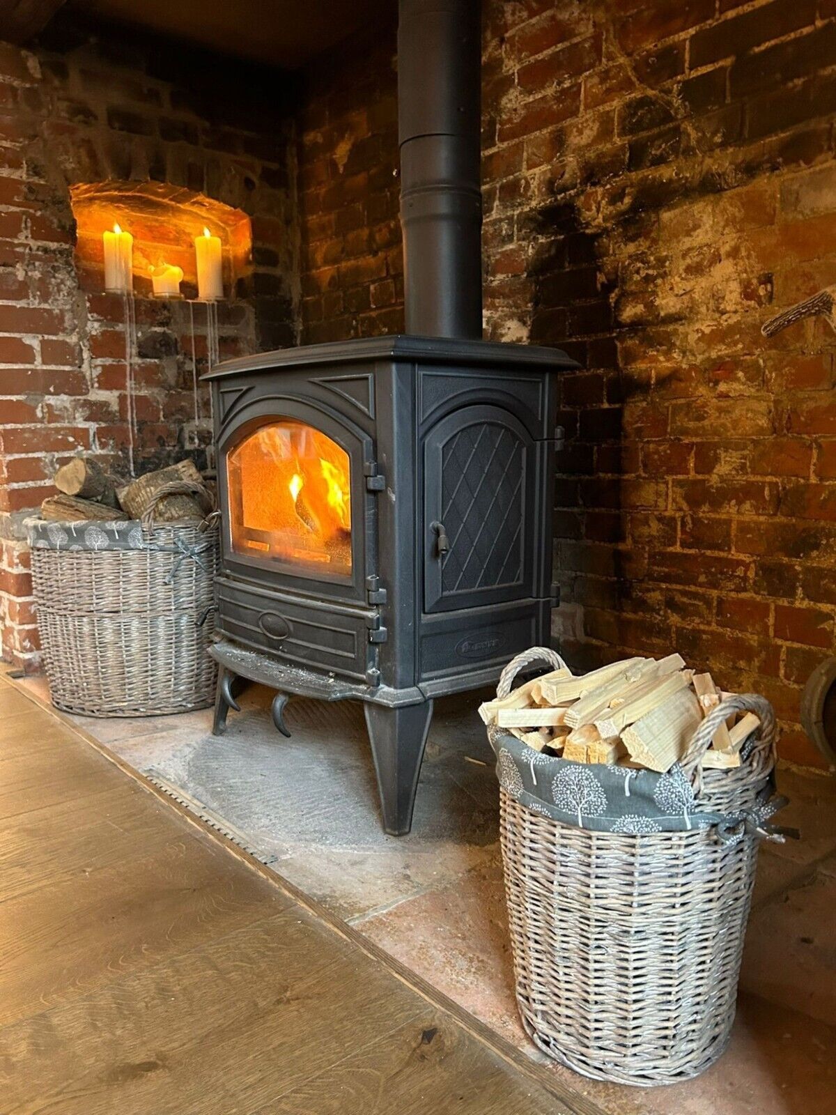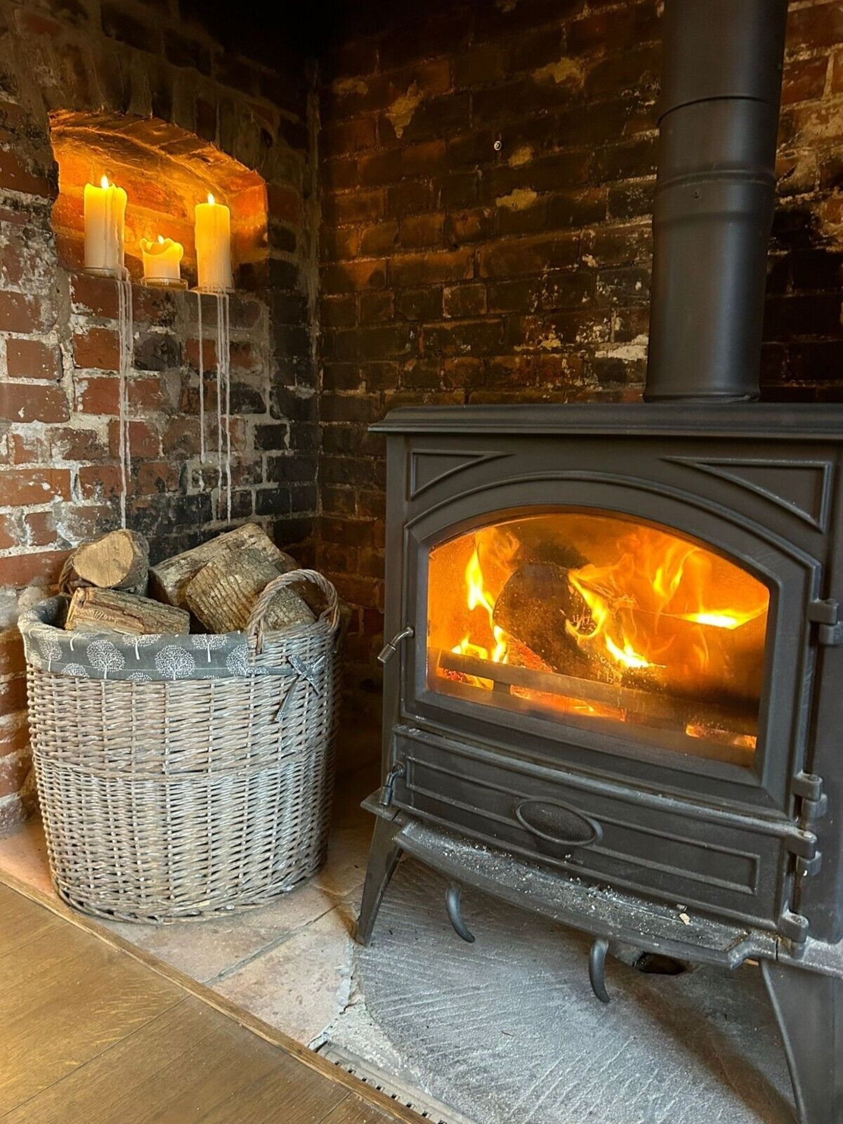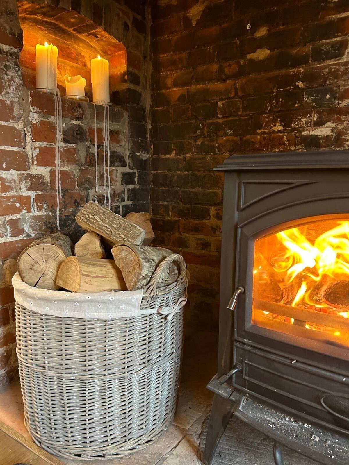 Round Grey-wash Wicker Log Fireside Storage Basket with Mulberry Liner