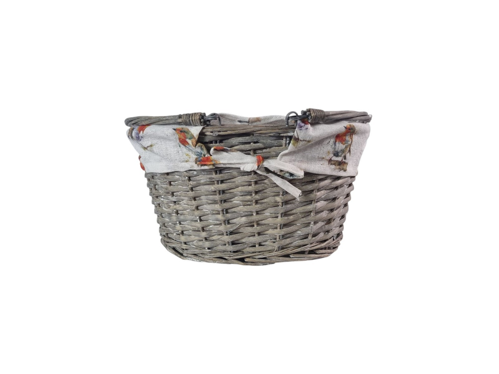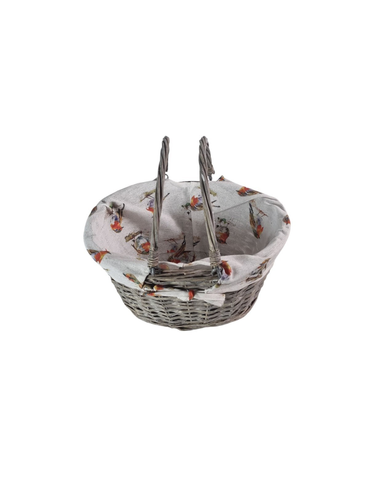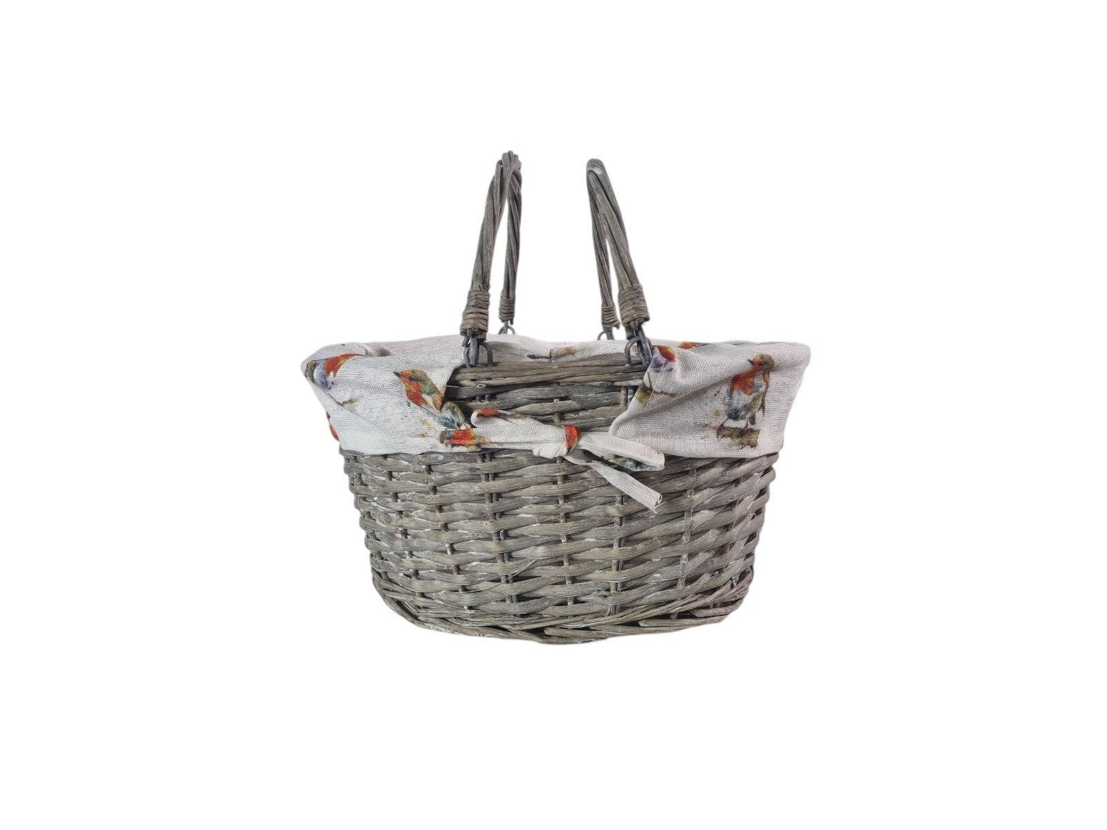 Grey Wicker Shopper Shopping Basket with Robin Bird Liner Fold Flat Handles