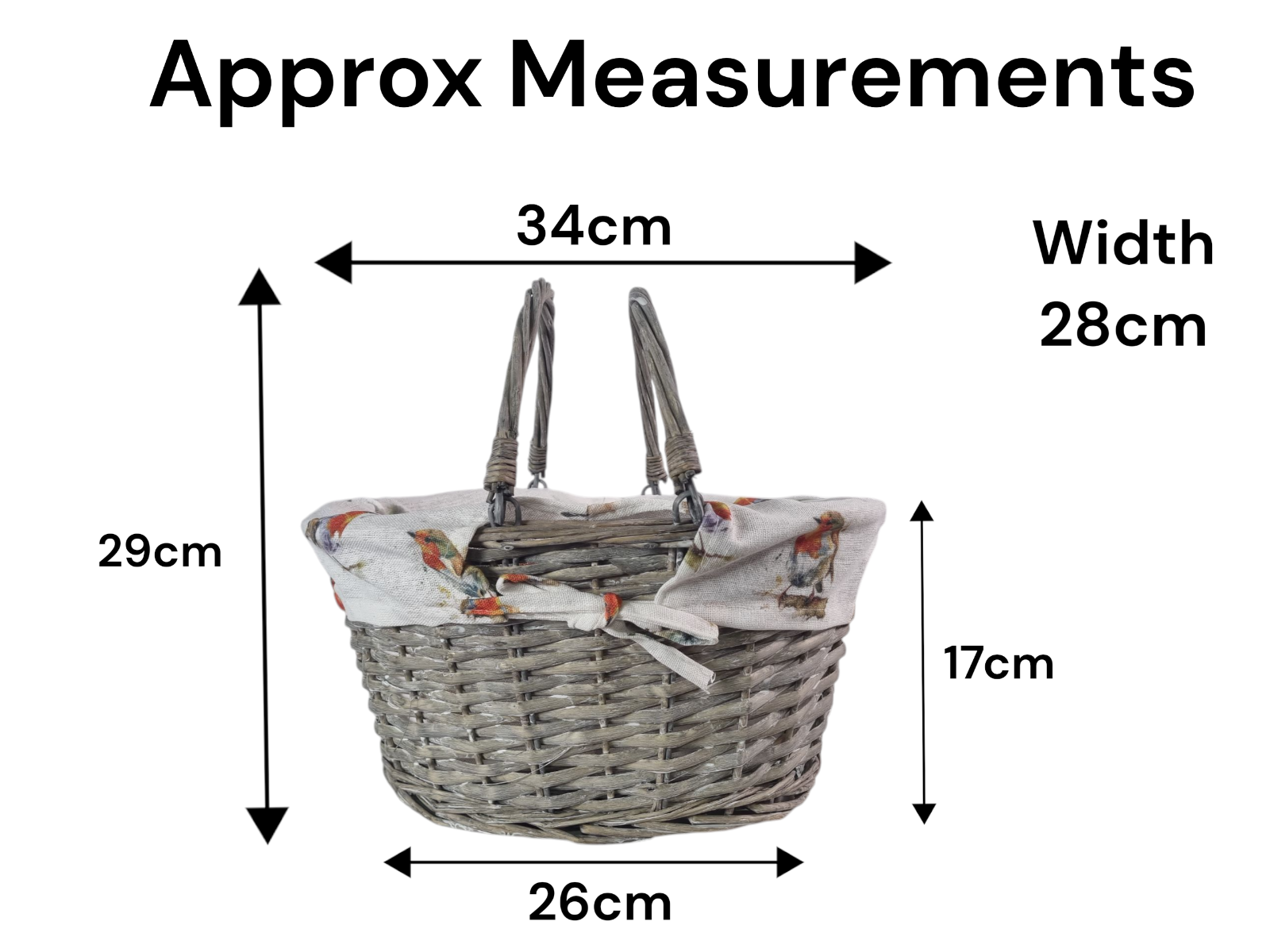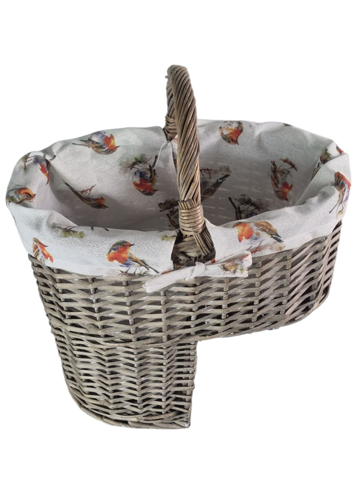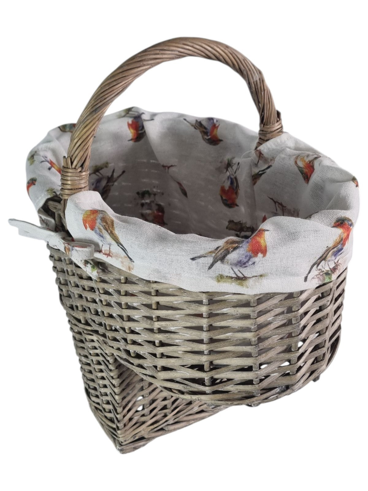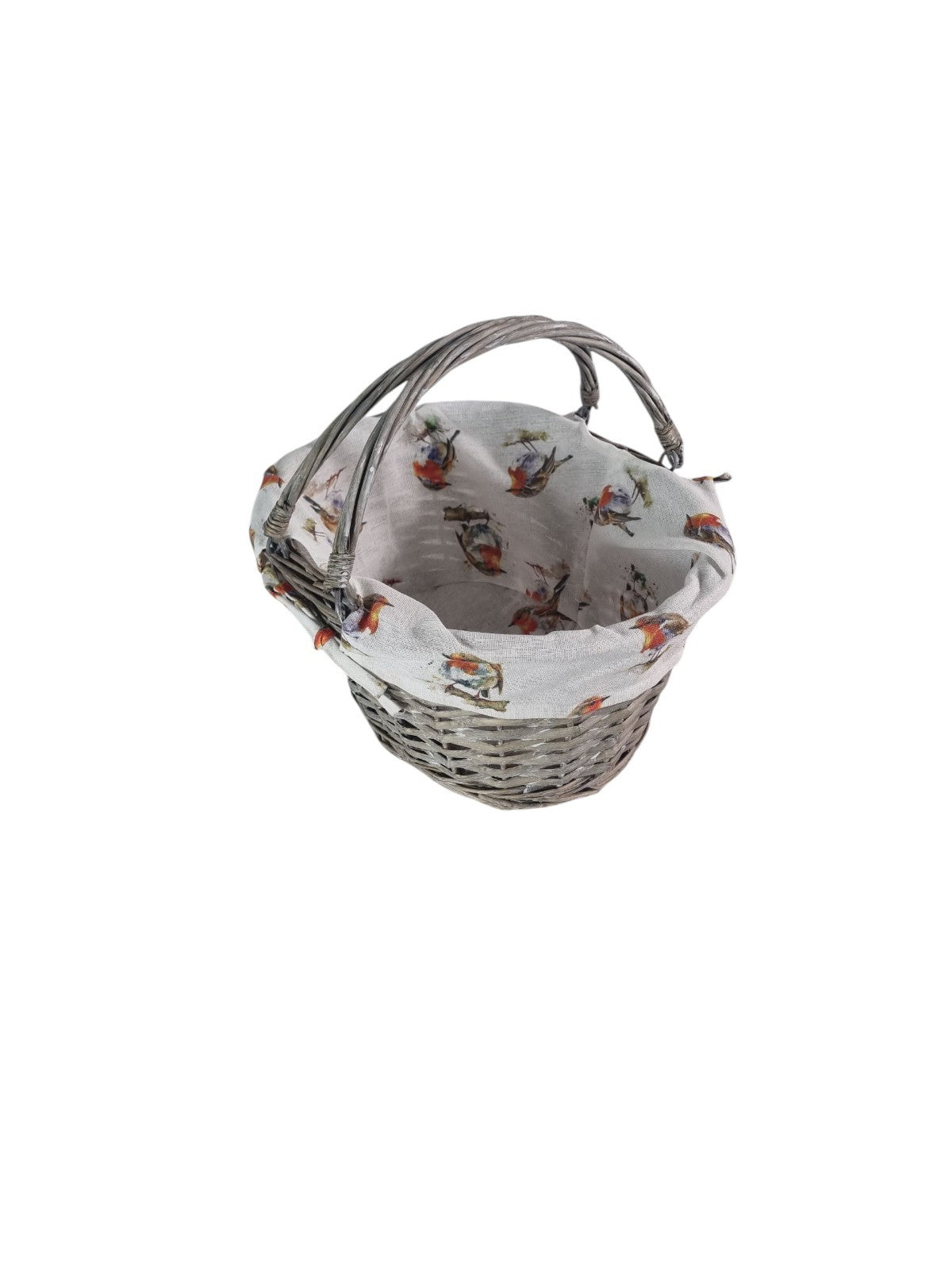 Grey Wicker Shopper Shopping Basket with Robin Bird Liner Fold Flat Handles