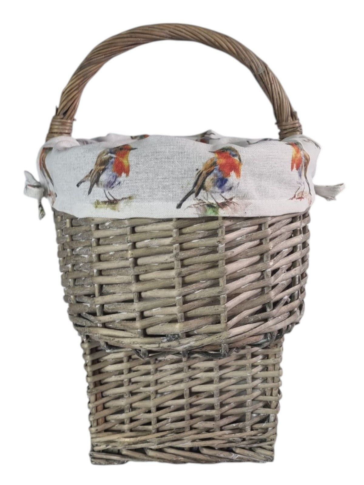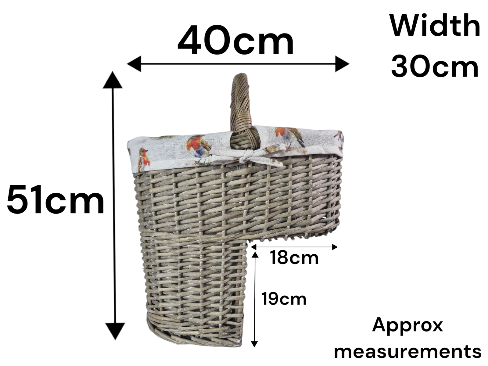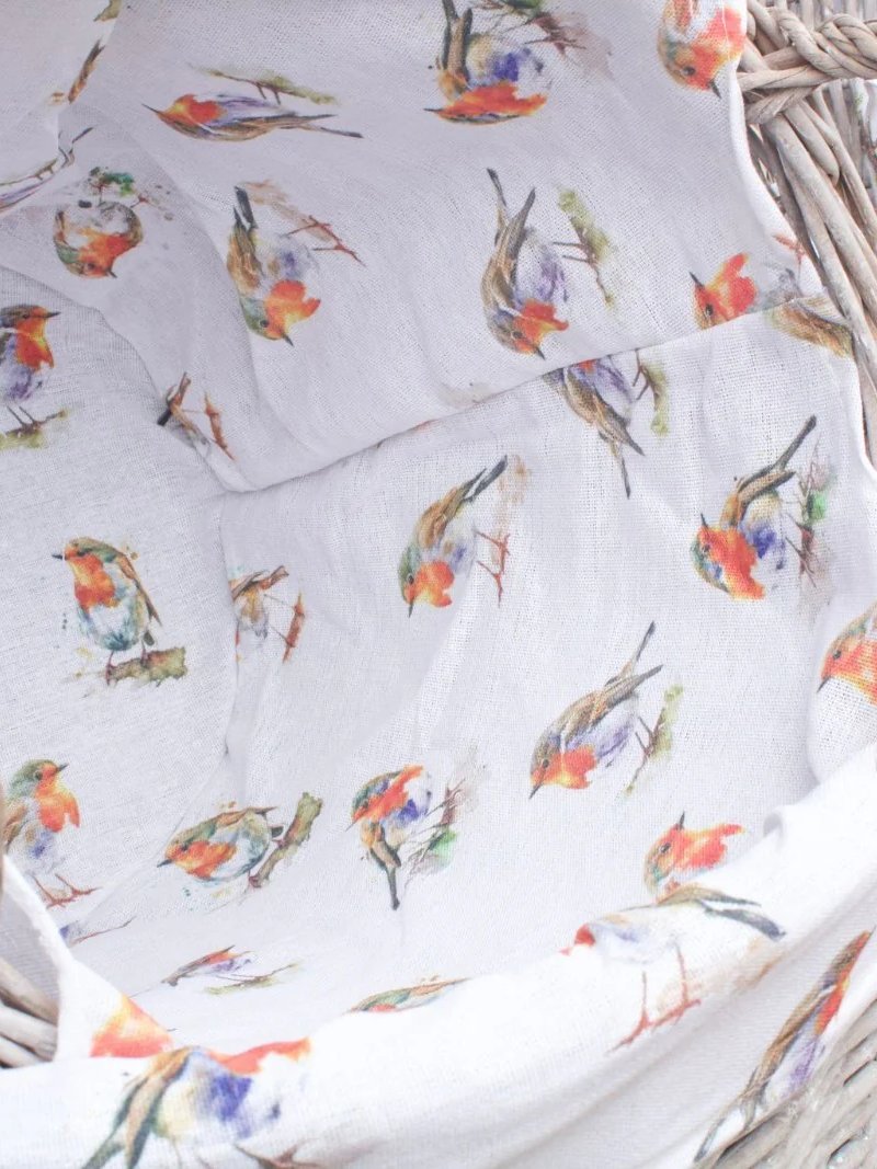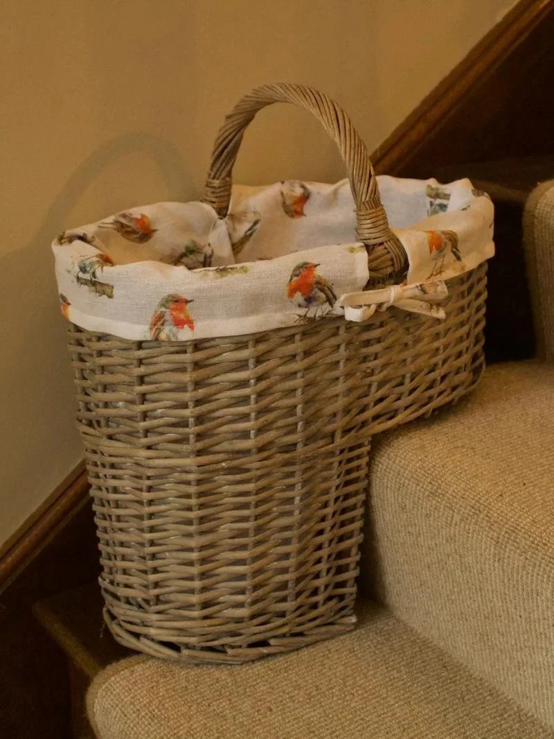 Grey-wash Wicker Stair Basket with Robin Bird Liner Home Stairs Storage Tidy