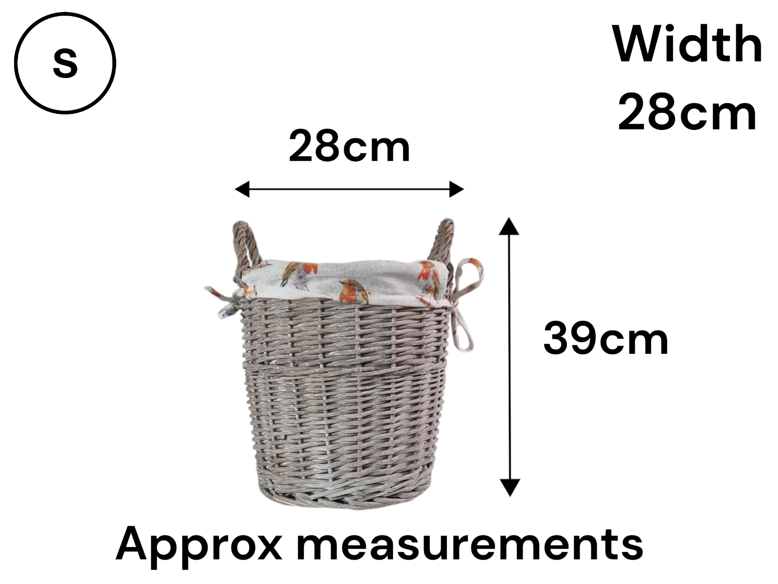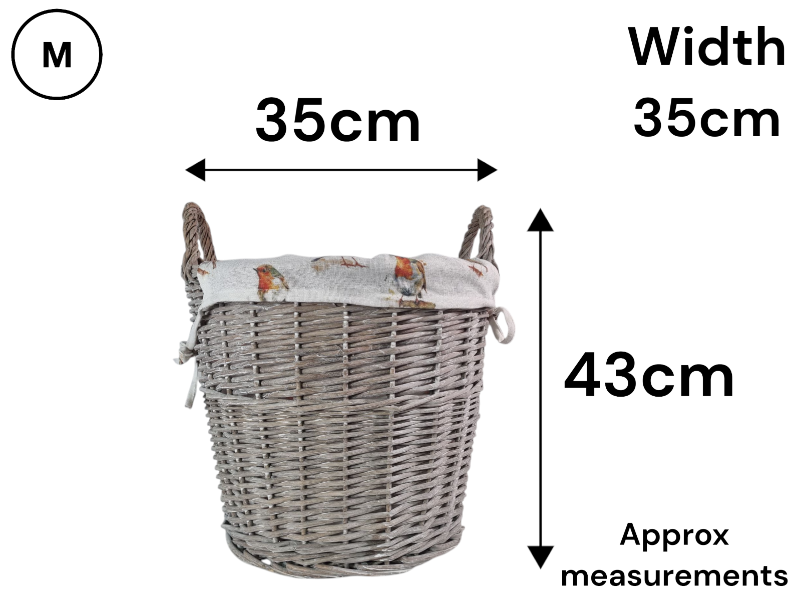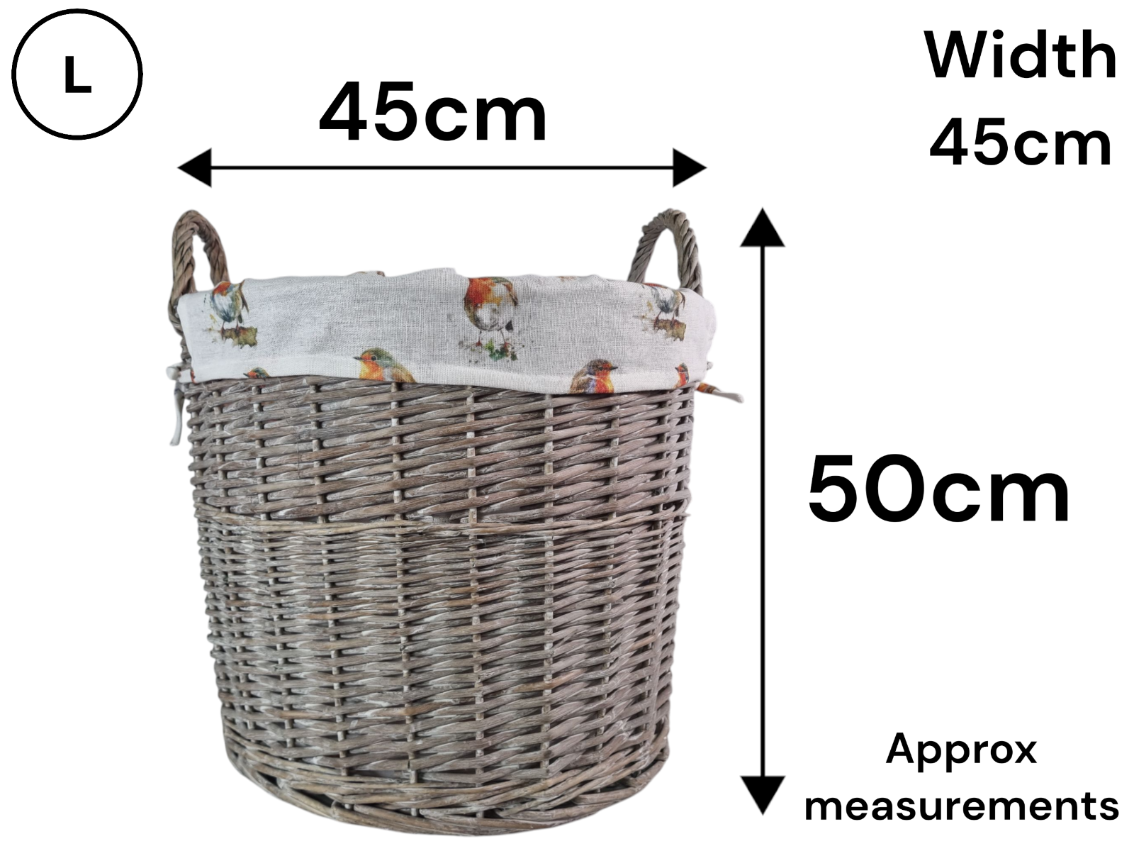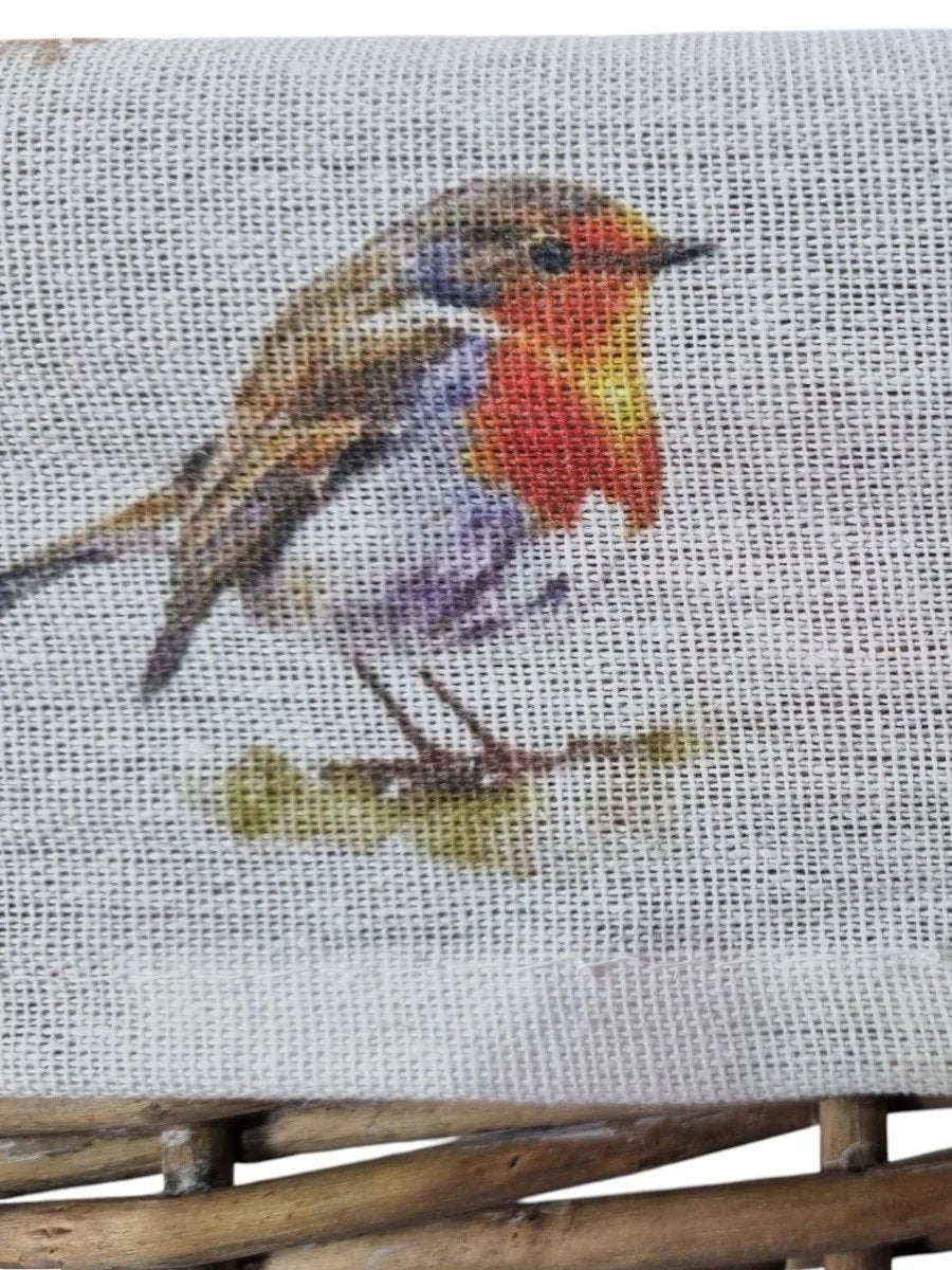 Grey-wash Wicker Stair Basket with Robin Bird Liner Home Stairs Storage Tidy