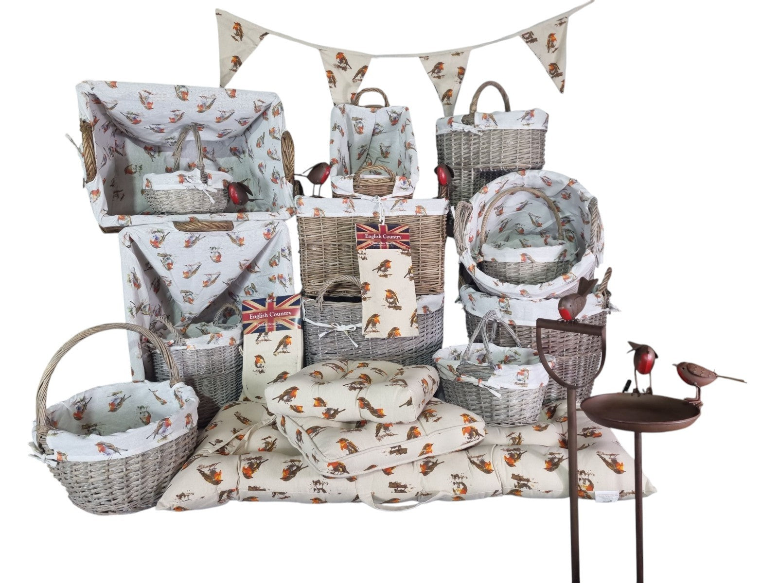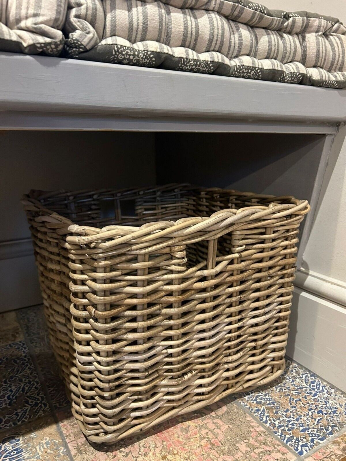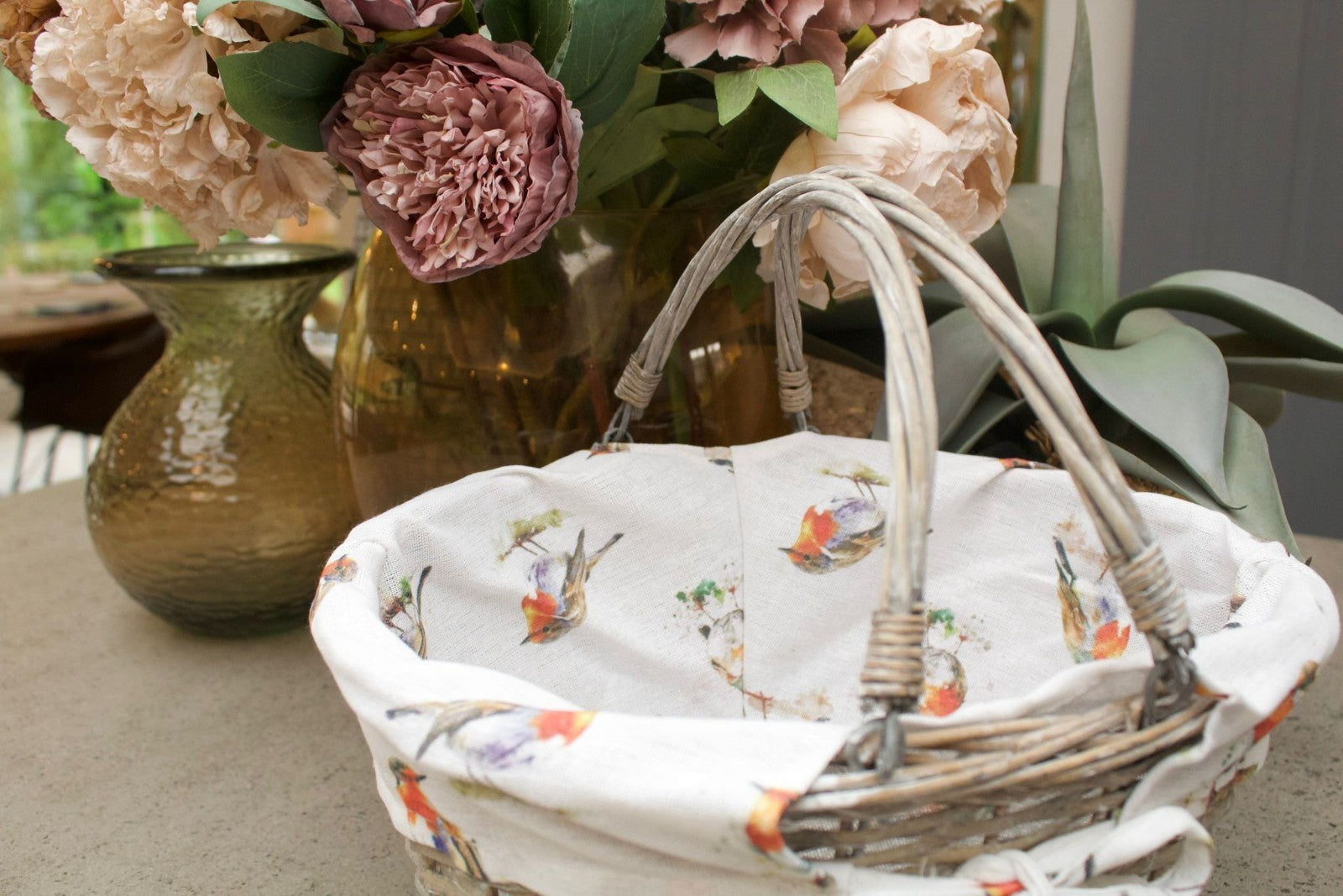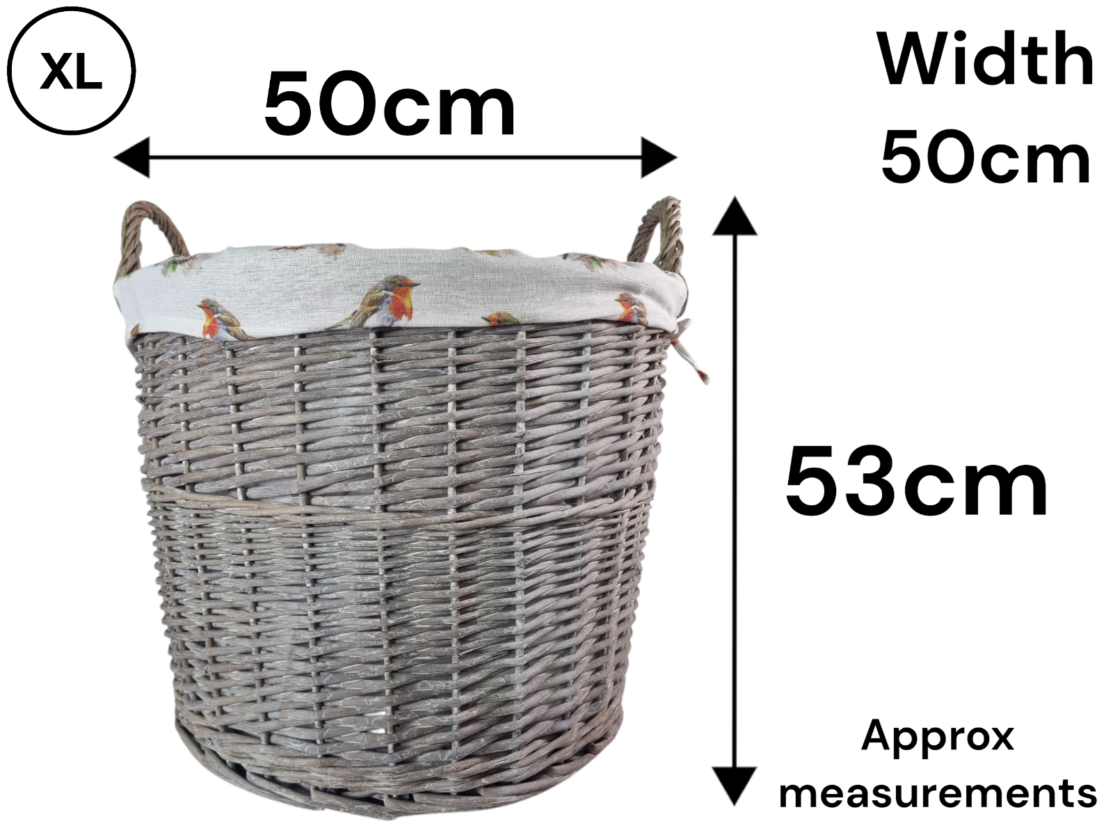 Grey-wash Wicker Stair Basket with Robin Bird Liner Home Stairs Storage Tidy