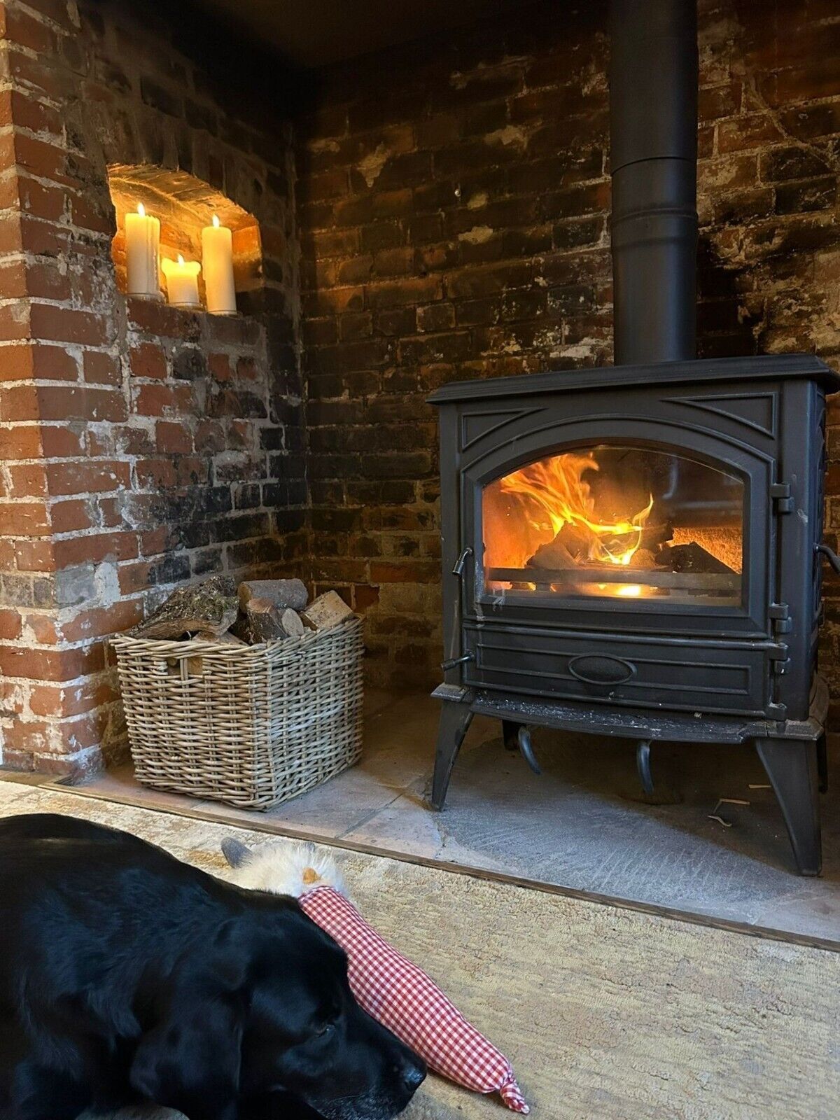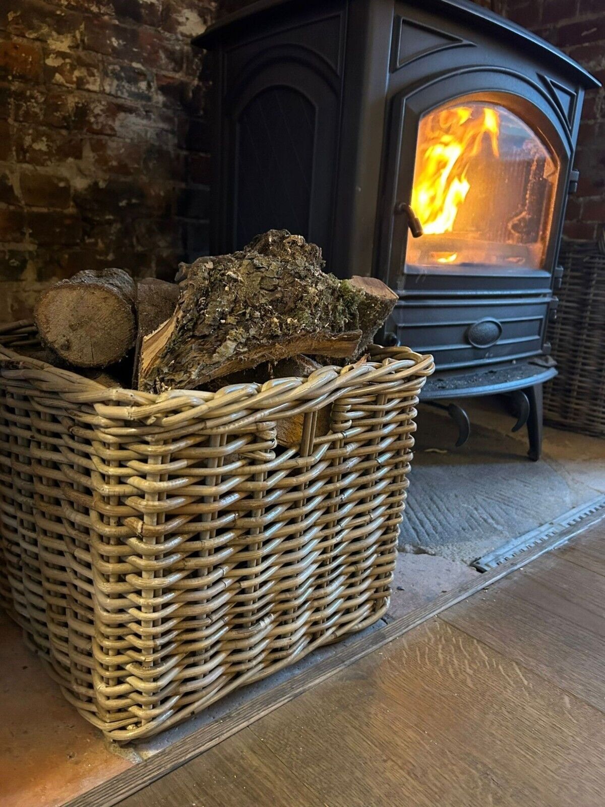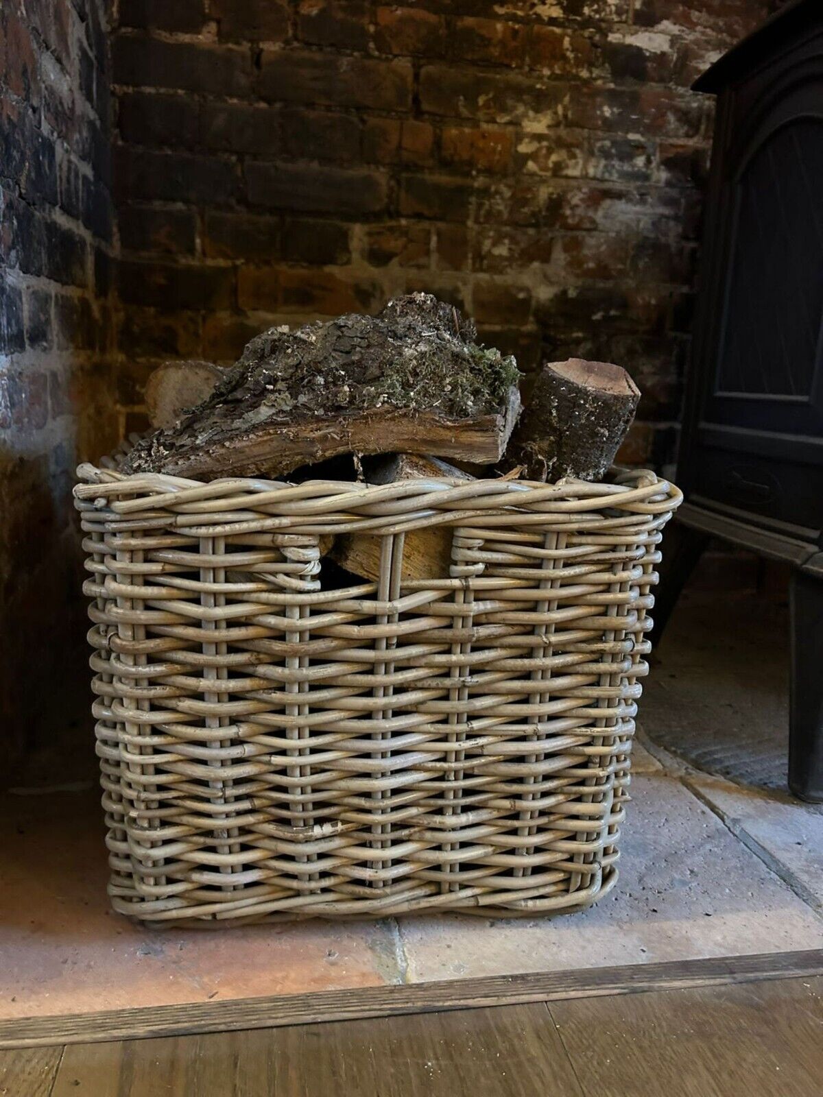 Square Grey-wash Wicker Log Fireside Storage Basket with Daisy Liner