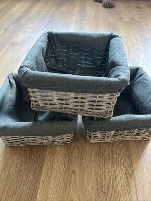 Grey-wash Wicker Square Basket with Grey Liner Storage Hamper Set of 3