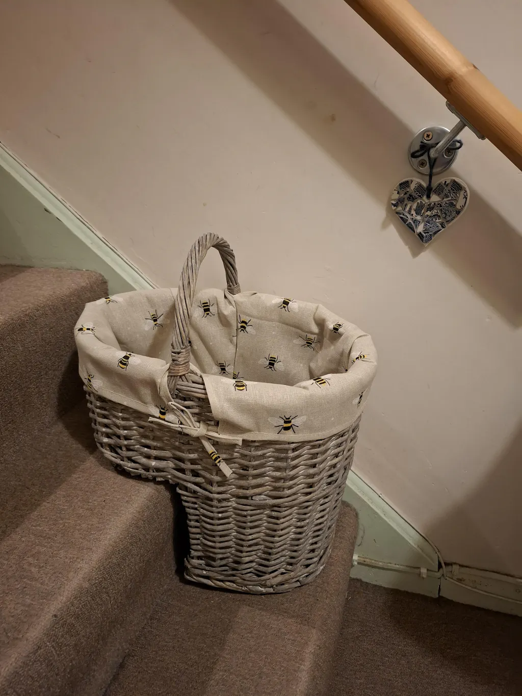 Grey-wash Wicker Stair Basket with Bee Bumblebee Liner Home Stairs Storage Tidy
